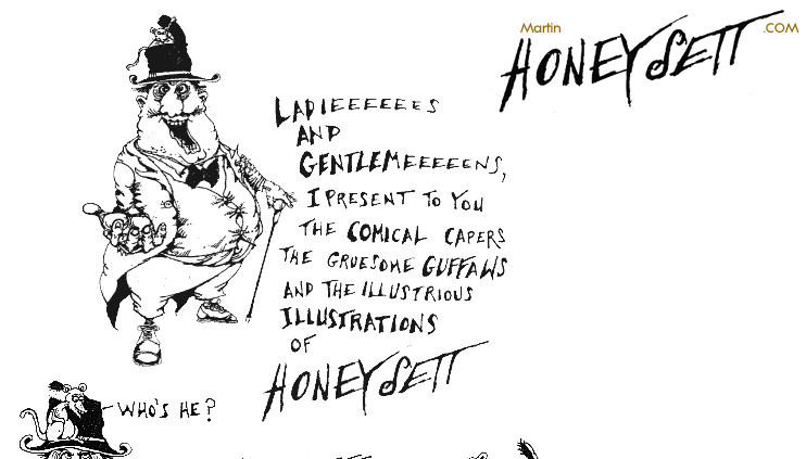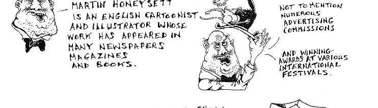 Martin Honeysett is a cartoonist and illustrator who's work has appeared in many newspapers and magazines, including Punch, Private Eye, The Spectator, The Oldie, The Sunday Telegraph and The Observer. He has had numerous books published and illustrated many others, including "Bert Feggs Nasty Book" by Terry Jones and Michael Palin, "The Queen and I" by Sue Townsend, "H Prince" by Dick King Smith. Also a series by Ivor Cutler, "Life in a Scotch Sitting Room", "Glasgow Dreamer", "Gruts" and "Fremsley". His work has also appeared in a number of public exhibitions, including The Cartoon Gallery and Watermans Arts Centre in London. His cartoons have won several awards at International Festivals in Europe and Japan and been acquired by the University of Kent and the V&A Museum in London